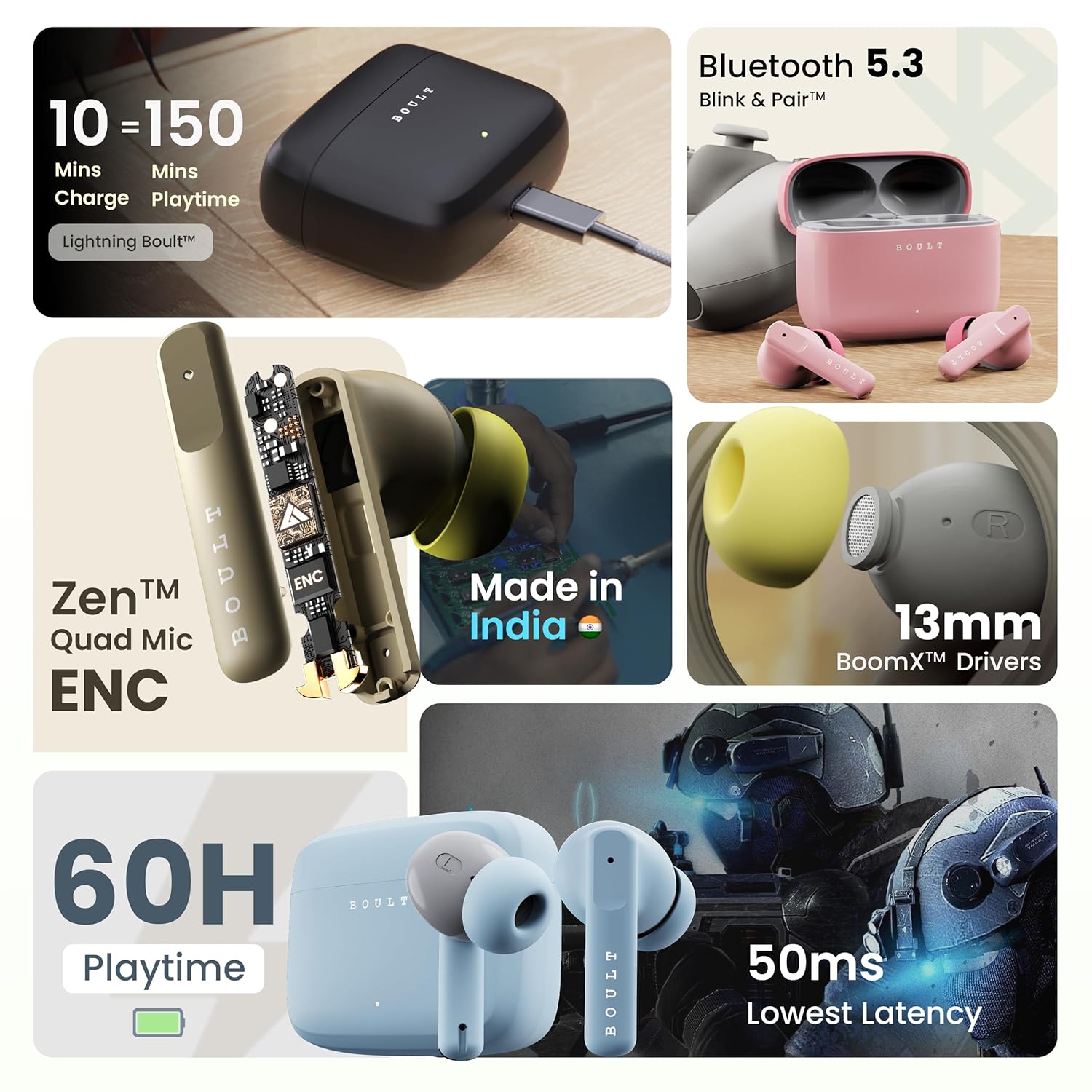 ‎4 Clear Calling ENC Mics, Bluetooth 5.3, Sweatproof, Noise Cancellation, 13mm Rich Bass Drivers, Type-C Fast Charging, 60Hrs Playtime, Microphone Included, 50ms Low Latency Gaming Mode, Touch Control |